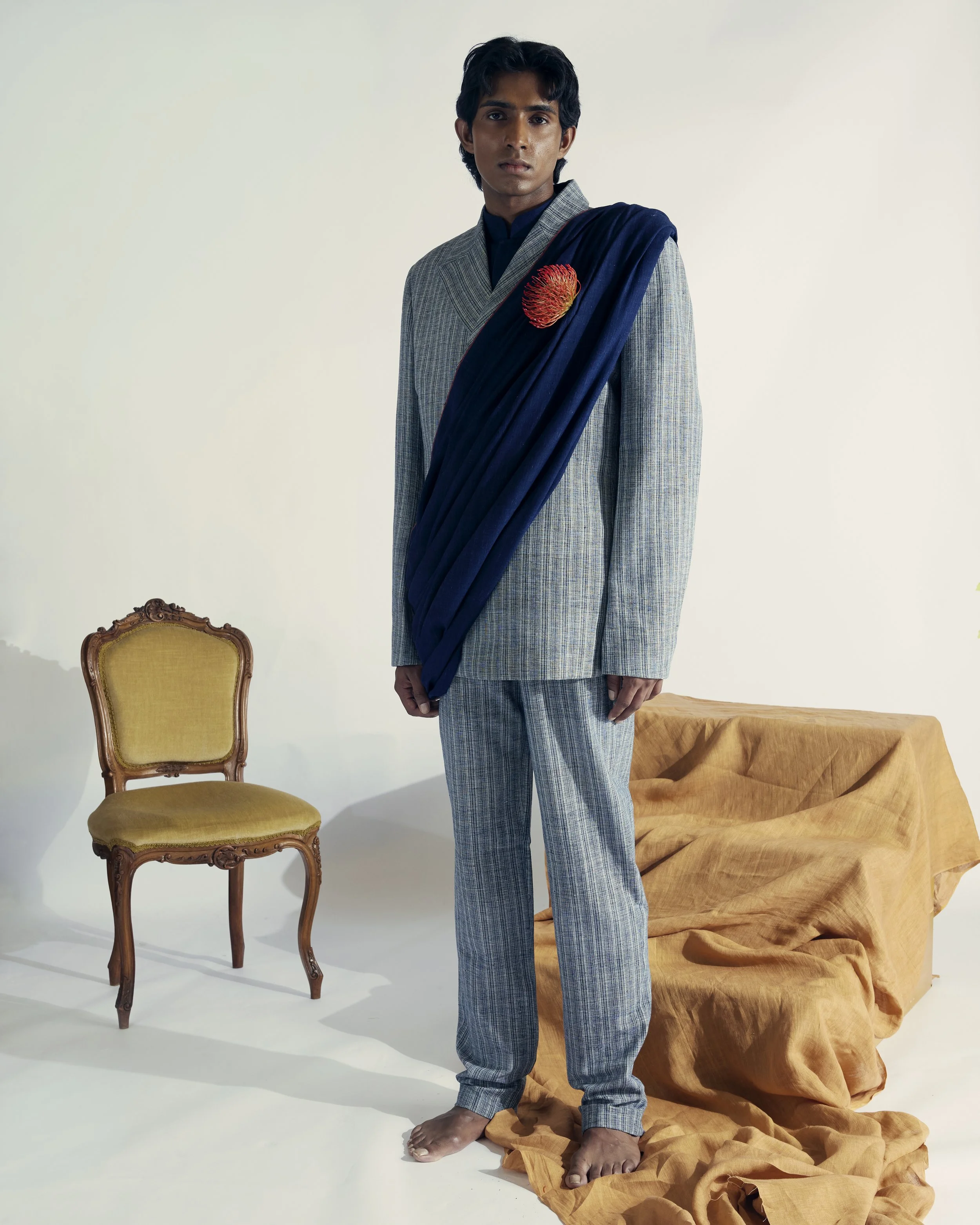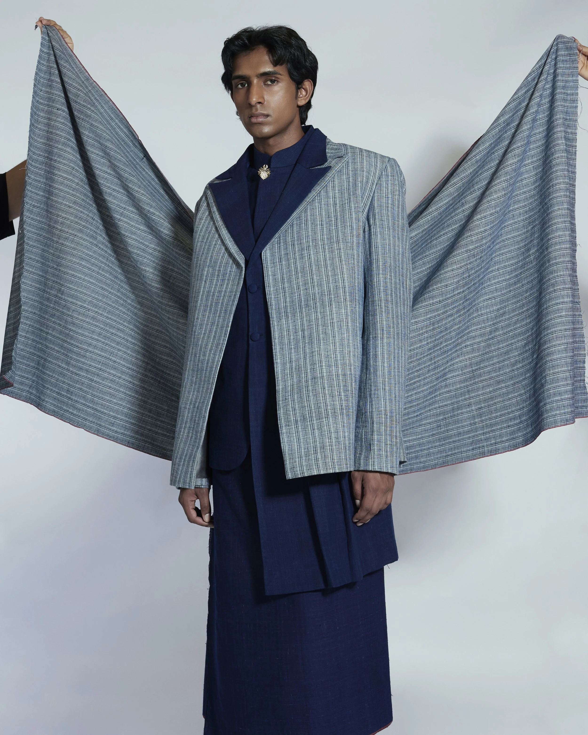 Handcrafted from 100% hand-spun and hand-woven Khadi cotton, this impeccably lightweight piece is designed for effortless elegance and comfort. Thoughtful details complete the design, including a 100% silk lining and a discreet hook-and-eye closure, lending a refined and sophisticated finish.